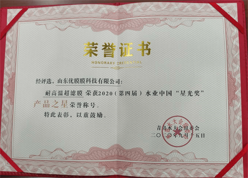 本次大会设立了2020(第四届)水业中国“星光奖”“产品之星”的评选活动,参与评选的产品都是来自全国各地的具有雄厚实力企业的拳头产品,经历层层评选,山东优膜膜科技有限公司耐高温超滤膜凭借优越的化学稳定性和超高的耐温性能一举获得了2020年第四届水业中国“星光奖”“产品之星”的荣誉称号,在此,特别感谢组委会对优膜科技耐高温超滤膜给予的高度肯定。