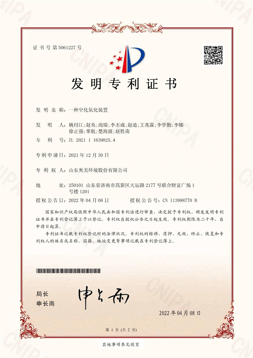 日前,公司又获得一项发明专利证书,名称为“一种空化氧化装置”,专利号为ZL2021116398254。