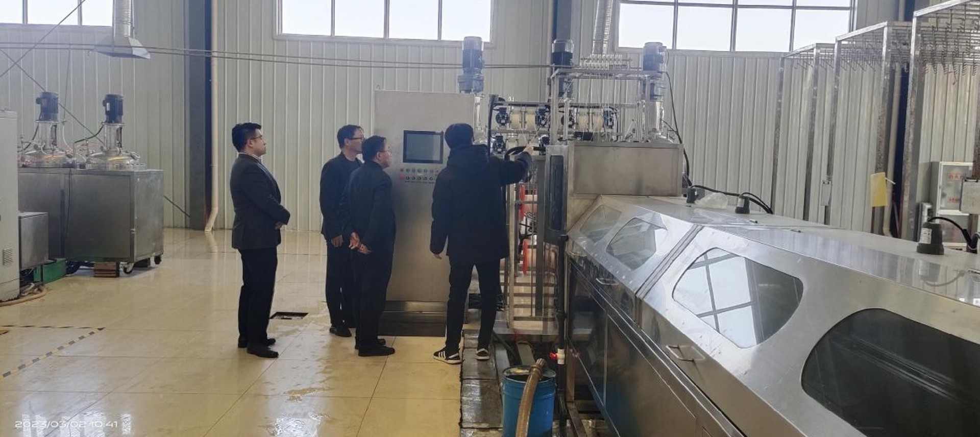 水发优膜管理人员向孔令杰董事长介绍新纺丝设备运行原理及运行情况。